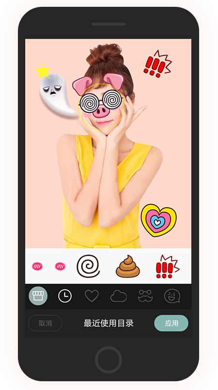 自动识别脸部整形功能,可放大眼睛、微笑、瘦脸等; 触屏整形、美肤功能,指尖一点,让自己美美哒;超过200种的发型与妆容模板,随意变换你的魔力心情