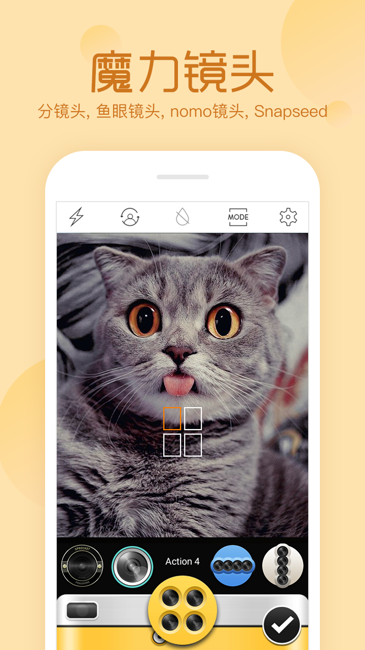 提供不同魔力的多种拍摄镜头,有分镜头、鱼眼镜头、nomo镜头、snapseed等;强力防抖、定时、触屏、设置焦点、静音;通过连接蓝牙支持自拍杆拍摄。