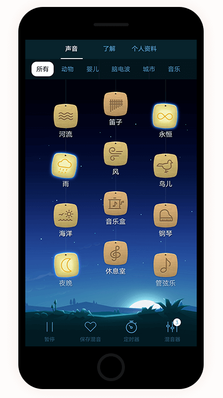 1. 超过50个动听的高品质环境声,包括2个用于脑波输送的双声拍频率。 2. 组合喜欢的声音和音乐以打造个性体验,可调各个声音的音量。组合的可能性是无限的!可打造上千种入睡的方式! 3. 包含8个现成的收藏可立即使用 4. 可轻松创建、保存、命名、排序和重新播放你的收藏 5. 定时器系统可设置收藏组合音乐的持续播放时间。非常适合睡眠时使用。 6. 独特而精美的界面方便轻松选择声音 7. 48个高品质白噪音环境声和音乐